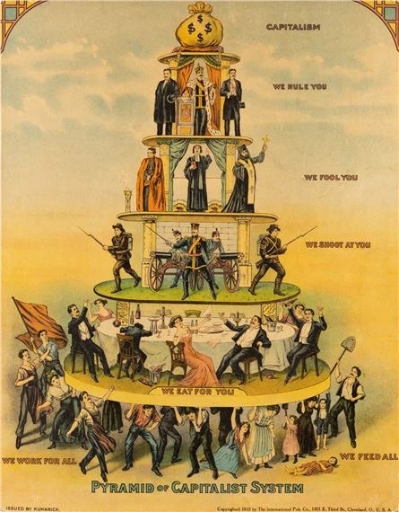 Capitalist modernity has undermined liberal society due to its two basic pillars. The first is the pyramidal structuring of society. Under capitalist modernity, society is ordered with a vast number of workers at its base, a small number of capitalists at its height, and an army of state officials and organizations that exist to advance the interests of the capital owners. The second is the free market system of economic competition. Due to these systems, a corporate elite has been able to hoard the wealth of society. This ruling class is able to leverage their wealth to bend entire nations to their will. By buying out politicians, turning the vast majority of people into obedient workers, transforming vast tracts of earth for maximum profit, and controlling the flow of information they are able to make a mockery of democracy and liberty. The reality is, our political institutions exist to serve the ruling class, and not the rest of us.